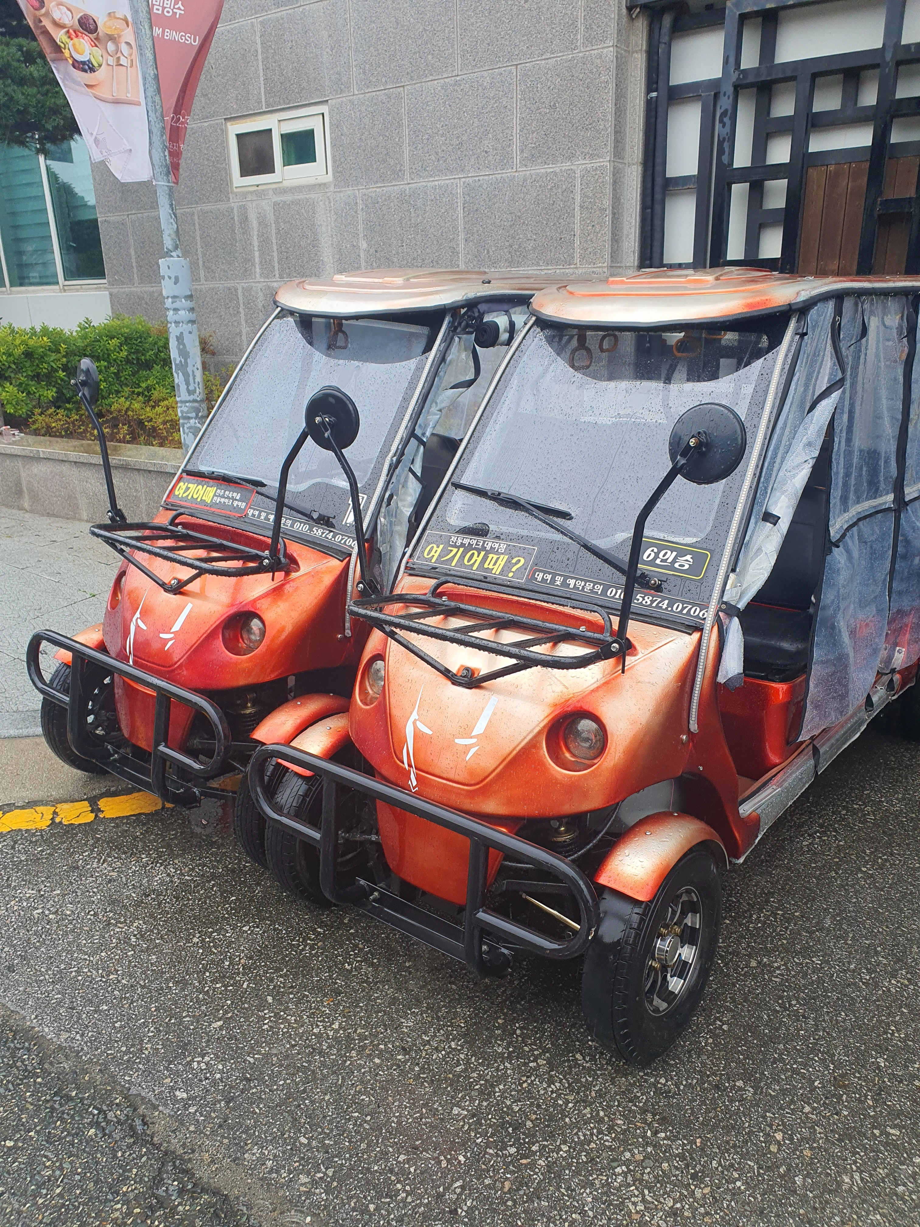전주여행 추천 코스 중 하나인 전동바이크! 하지만 비 오는 날에는 조금 조심해야 할 것 같아요. 우비를 입고 도전했지만, 습기와 시야 문제로 많이 불편했습니다. 특히 전주의 골목길은 돌길이 많아서 진동도 크고, 어린 아이와 함께 타기엔 조금 무리가 있었어요.
